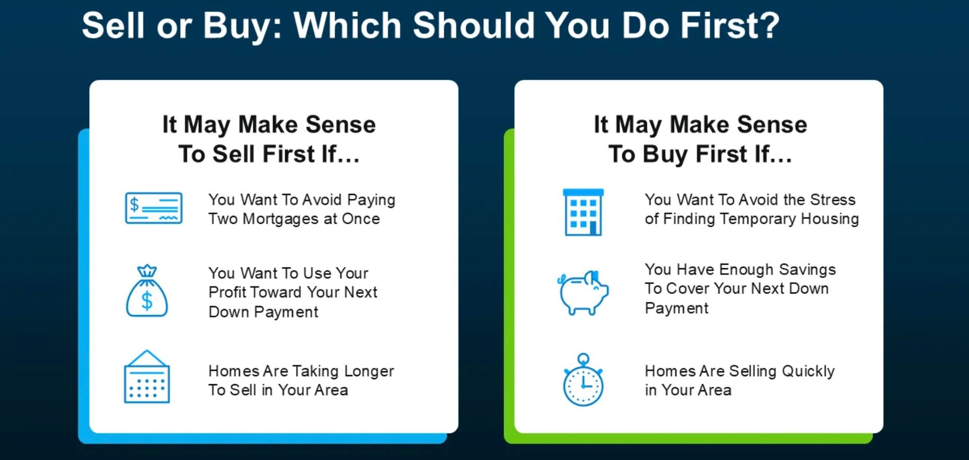 “It’s best to sell your old home before buying a new one to avoid unnecessary risks and possible headaches.”