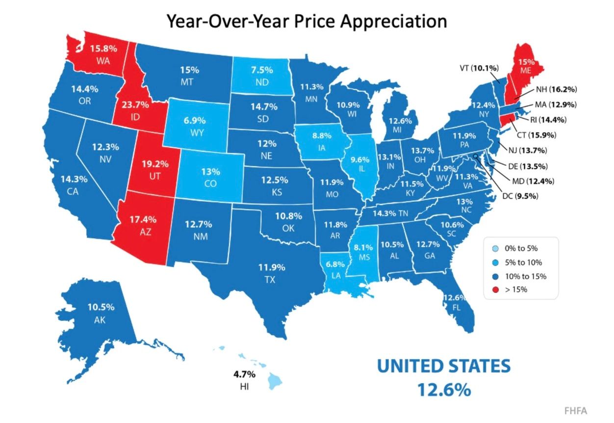 This first map, sourced from the Federal Housing Finance Agency (FHFA), highlights how home prices appreciated across the U.S. from Q1 2020 to Q1 2021. It’s a clear snapshot of the rising values many homeowners have experienced — and it reflects what we’ve seen on the ground locally as well.