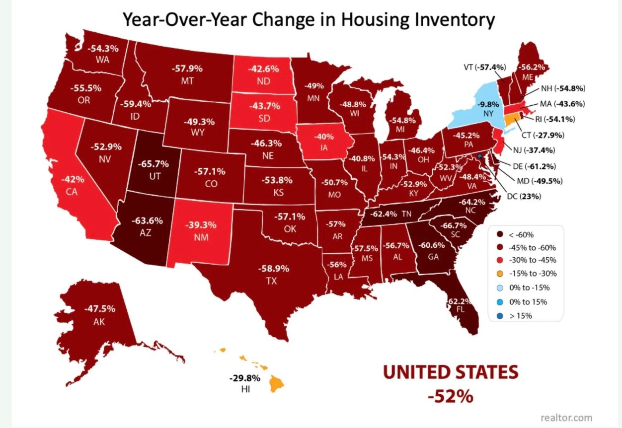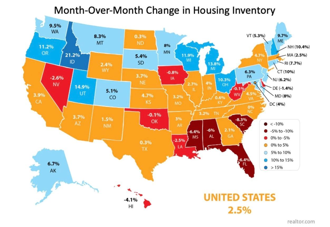 This second map from realtor.com shows how housing inventory has changed state by state over the past year. The link between limited inventory and price growth becomes evident when you compare the two — especially in states like Idaho, Utah, and Arizona. While the correlation isn’t always perfect, the broader trend is unmistakable: fewer homes + high demand = rising prices.