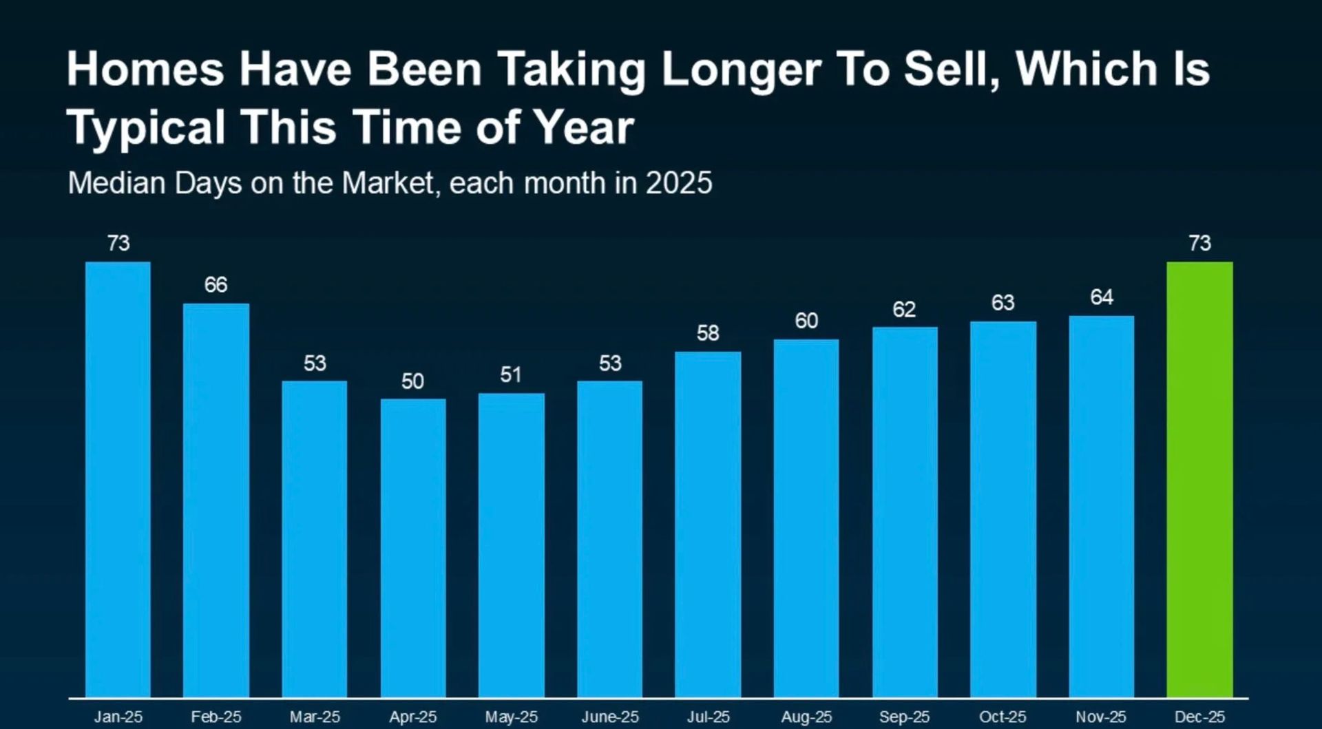 It’s important to note that the timeframe shown above reflects the national average, here in Silicon Valley, the pace is still much faster. Homes that sit on the market “longer than expected” are typically on the market for about 2 to 3 weeks, not months. So while 73 days may be considered normal nationally, local market conditions tell a very different story — and context matters.