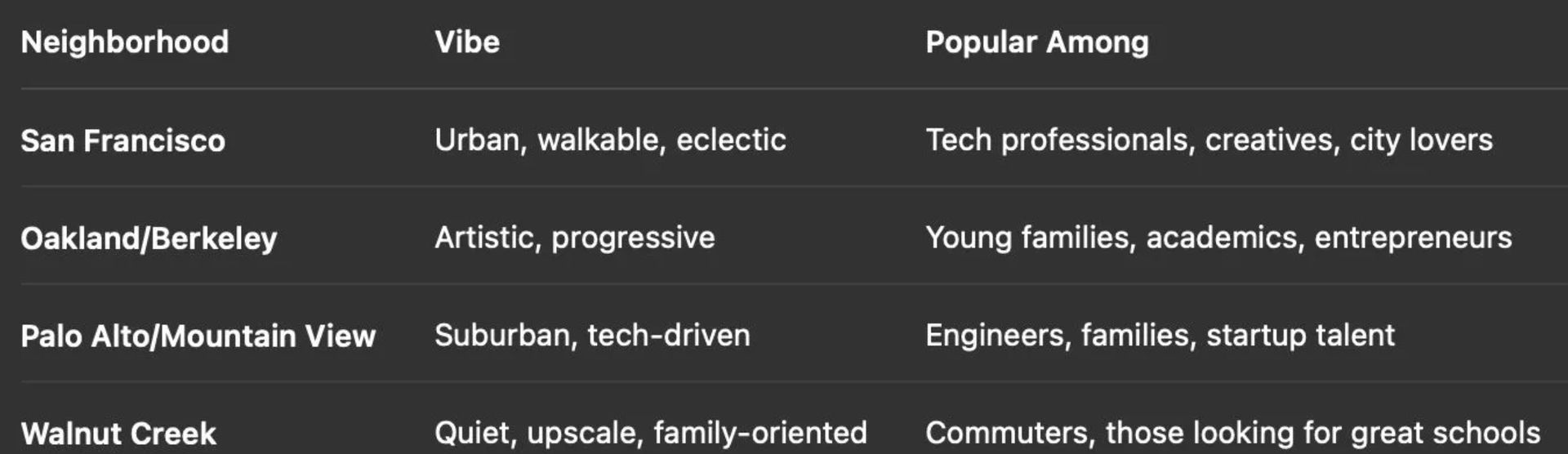 Each Bay Area city and suburb has its own rhythm, character, and community. Here’s a quick breakdown of just a few: